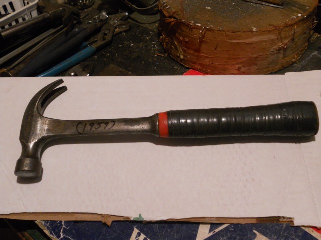 About a month ago, my father and I were doing a project in his workshop (some hair-brained garden “craft project” I had cooked up in my head) and I noticed he had written something on his old hammer.