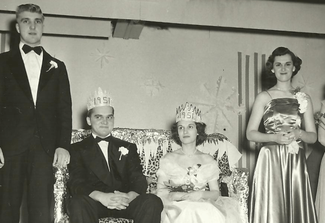 (Left to right, Erving Bickford, King of Winter Carnival, ’50, “Hermie,” Dianne Whittier, Rita Baumer, Queen of Winter Carnival, ’50)