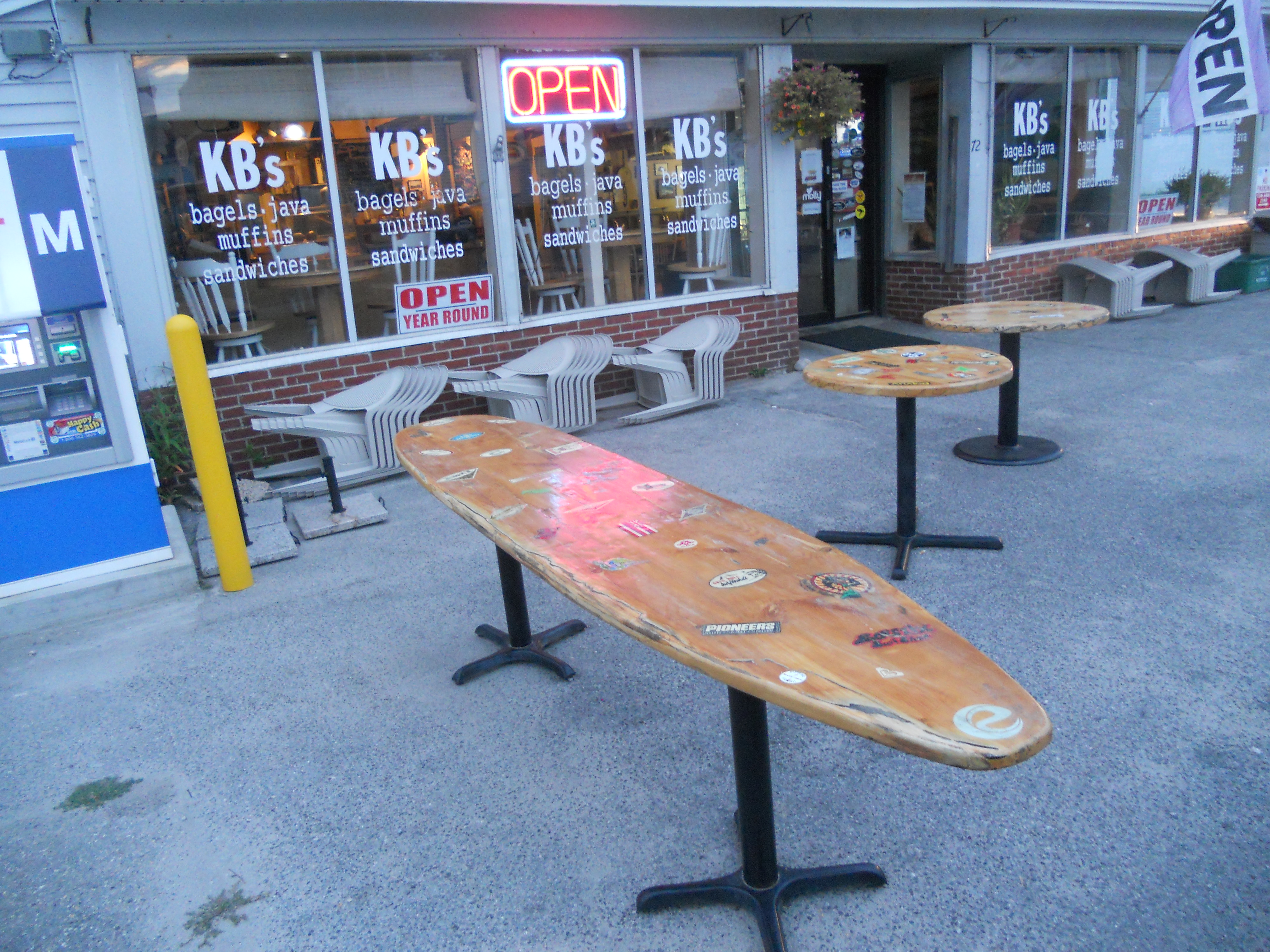 In addition to steady food, friendly people, and coffee, many of the regulars are surfers. The New Hampshire seacoast really has a surfing scene. Sure, it’s not Hawaii or California, but we have three surf shops, surf festivals, and lots of sidewalk surfers. I’ve seen people giving the “Shaka sign.”