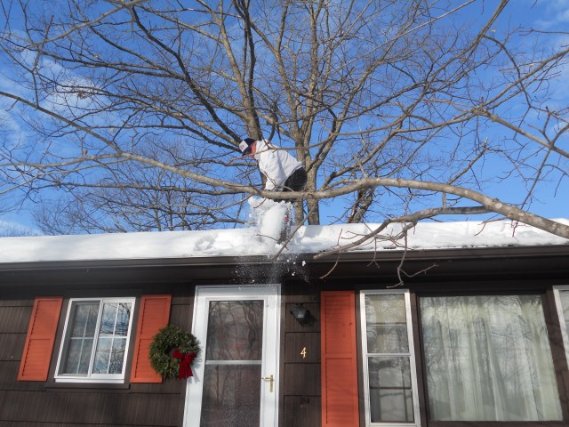 And he shouldn’t shovel off the roof, either. It’s good insulation, so long as you aren’t leaking heat into it to cause a melt-freeze cycle to tear up the roof and gutters.