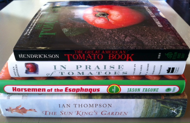 Tis puzzling. hmmm…. Well, I’d say that the Horsemen of the Esophagus is most different. Though it’s about food, it’s about food-eating contests, not gardens and such. And I’d guess that you bought In Praise of Tomatoes because it’s sounds like a book that you might write one day.