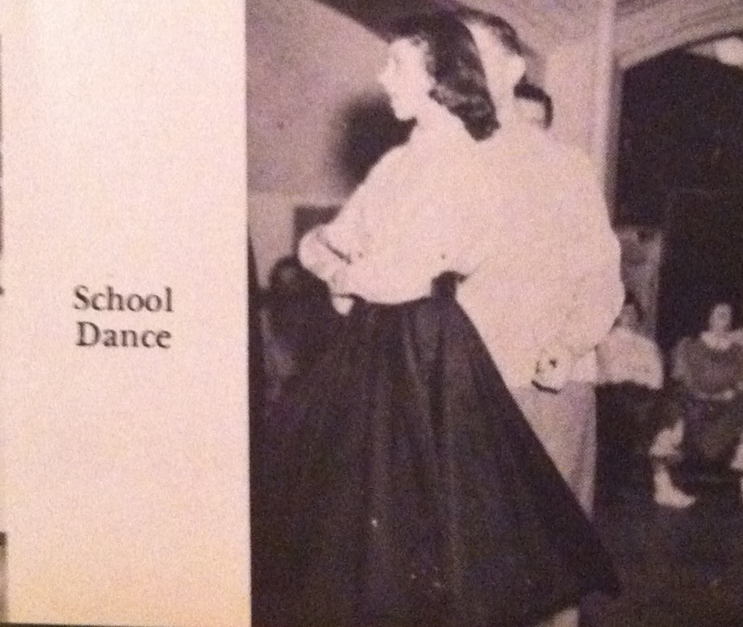 Some of the time, though, I just wanted to look at the clothing. There were bobby socks and saddle shoes and A-line skirts. I especially liked the corduroy full-skirted jumpers. St. Dom’s had a “Winter Carnival Weekend” and the Fair Isle-style sweater was popular with a pair of side-zipped slacks. Then there were the pictures from the spring prom; all the young women were floating around in New Look-style gowns and dresses over lots of petticoats. When I was twelve, I imagined my own high school prom might look like that and I could practically imagine the future day when a young man in a white sport coat and a pink carnation would knock on the door to escort me to the dance.