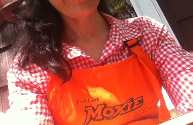 I didn’t have any lines on Saturday when the Moxie Media Maven, Deb Wagner, took some pictures of me cooking with Moxie at Chummy’s Midtown Diner in Lisbon Falls. I wore my Moxie apron and poured and stirred a few cans of Moxie into an orange Pyrex bowl, smiling and laughing. A press release will be going out this week about the recipe contest.