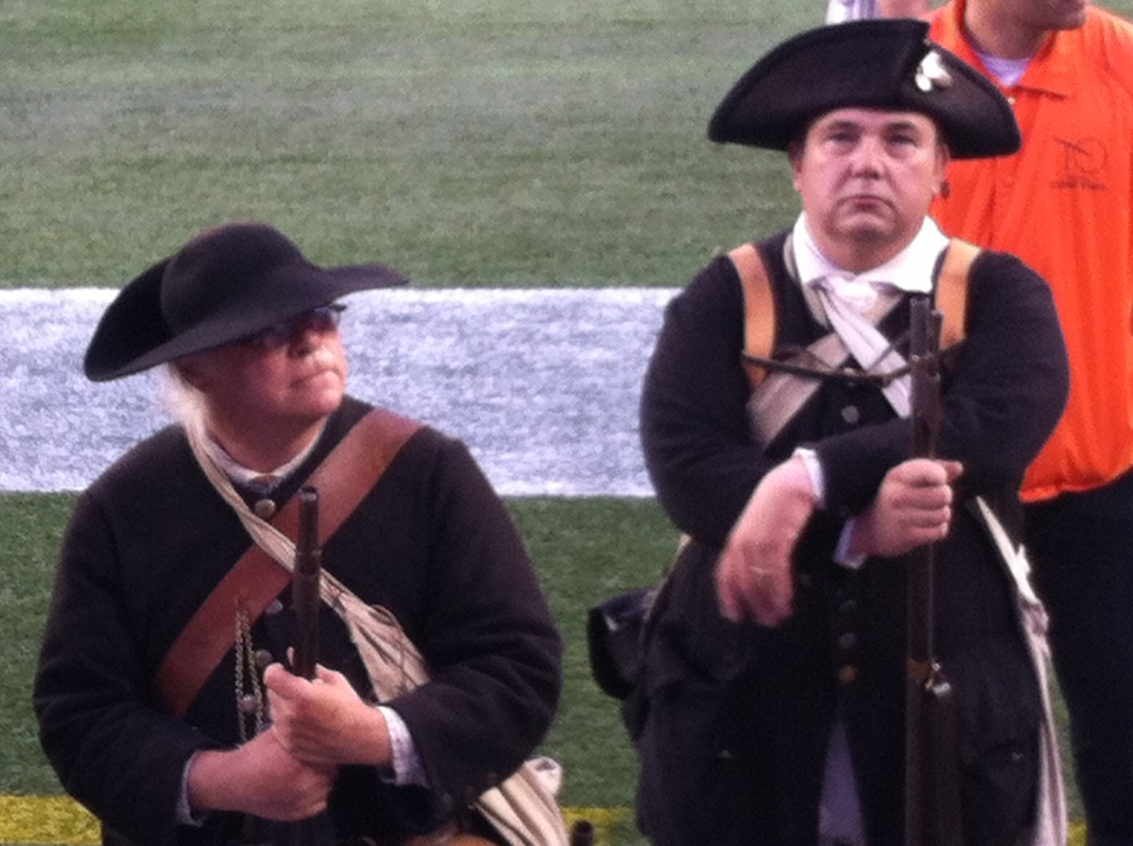 I was distracted by the spectacle, especially The End Zone Militia. These Revolutionary War re-enactors fire off their muskets at different points in the game, including every time the Patriots score. One member, the leader, looked a little bit like images I’ve seen of Samuel Adams. I wonder how they got those muskets to fit in their 12” by 12” by 6” clear plastic bags?