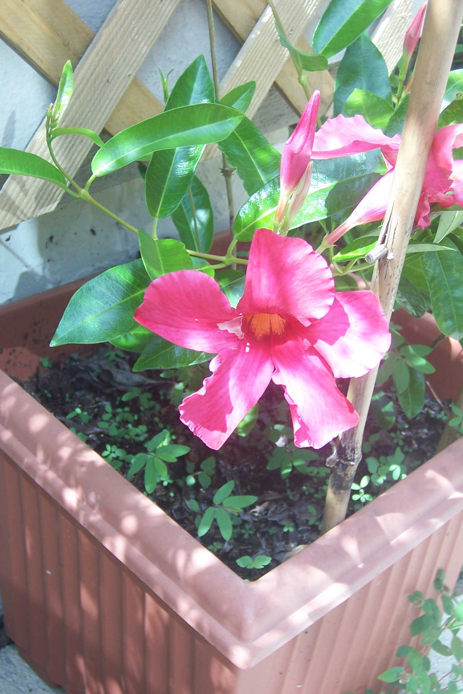 “I bought this one at the store. It grew quickly and thickly up the lattice with an occasional blossom, but then it nearly drowned (I drilled holes in its pot to drain it), and then it cooked in the oppressive Florida heat. It all died away except for one branch, barely visible over the weeds. I fed it, weeded it, kept it watered, and it has returned with a handful of blossoms in exchange for just a few degrees drop in temperature. In the background a new vine has extended itself and started to reclaim the lattice.”