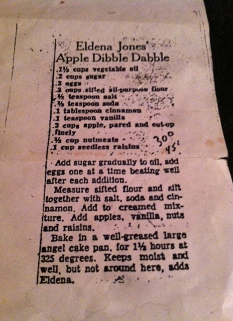 One fall, we had a “team building” session at the LAW’s family camp. I think it was a pot-luck and one of the desserts she made was an apple cake called “Eldena Jones’ Apple Dibble Dabble.”