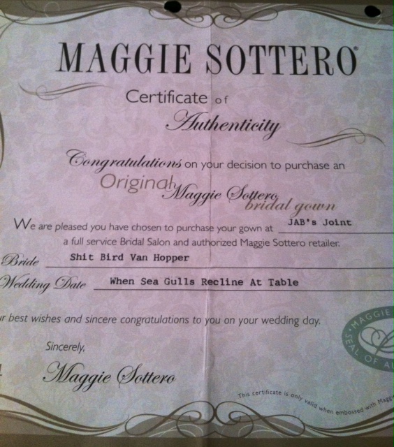 One additional inoculation against (gasp!) walking down the aisle in a fake Maggie Sottero dress was the “Certificate of Authenticity” the bride received when she bought her dress.
