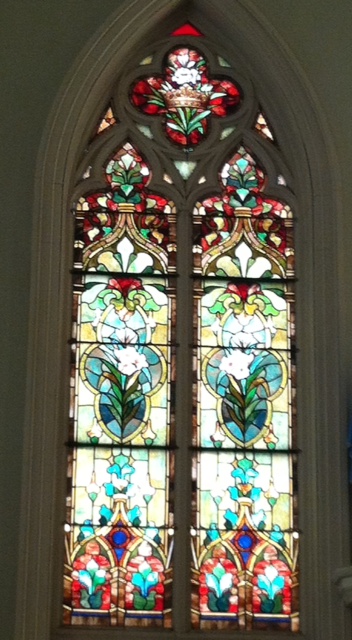 A closer look at the stained glass inside the St. Mary’s Hospital chapel in Lewiston, Maine.