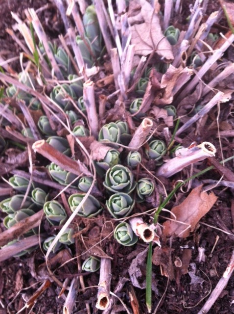 The week flew by and I scrambled each day to spend time raking and cleaning out the gardens. I wasn’t here at this time last year and when I closed on the house at the end of May, the gardens were overgrown and out of control. I pruned aggressively and I think I accidentally pulled out a few crocus bulbs not realizing those green grassy spikes were actually crocus leaves. The ones that have come up in my front garden are sparse, unlike Helen’s. Many are just small single flowers and all are purple. They remind me of seed volunteers.