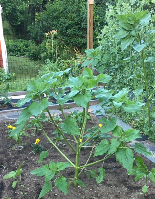 In the garden, a volunteer sunflower grows. While this particular Helianthus is an annual, occasionally a dropped seed will survive the winter and grow the following season. This one is the branching variety, meaning it will bear numerous flowers instead of one large flower head. It’s a green explosion and I’m anxious to see the bloom’s type and color. Sunflowers are August’s garden fireworks.