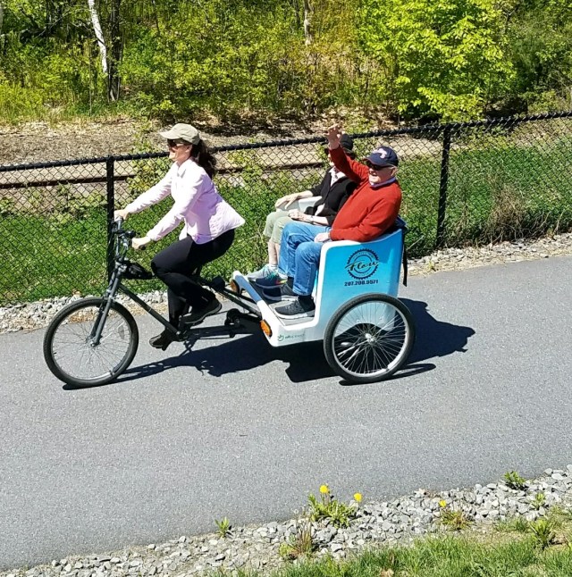 Thanks to Joe Dunham-Conway, of Portland’s Flow Pedicab, I “rented a rickshaw” and took my parents for a ride on Lisbon’s own Paper Mill Trail. What started out as a crazy co-writing idea about the Kennebec River Rail Trail turned into something closer to home. My two favorite octogenarians never tell me I’m eccentric and they’ve happily ridden shotgun with me on more than one hare-brained scheme. Fortunately, there was no speedometer within sight and I did not have to hear the concerned voice of my father asking “how fast are you going?”