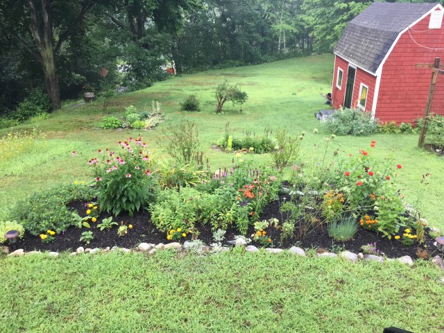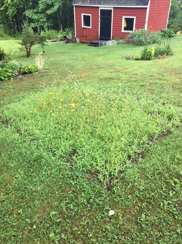 This spot is another project. In the spring, there is a row of daffodils along the barn side, but I’ve not found the right thing to plant. I’ve grown potatoes here twice, but I stuck some buckwheat seed in the ground this spring and I’m going to mulch it in soon. I’ve decided to plant all daffodils next spring.