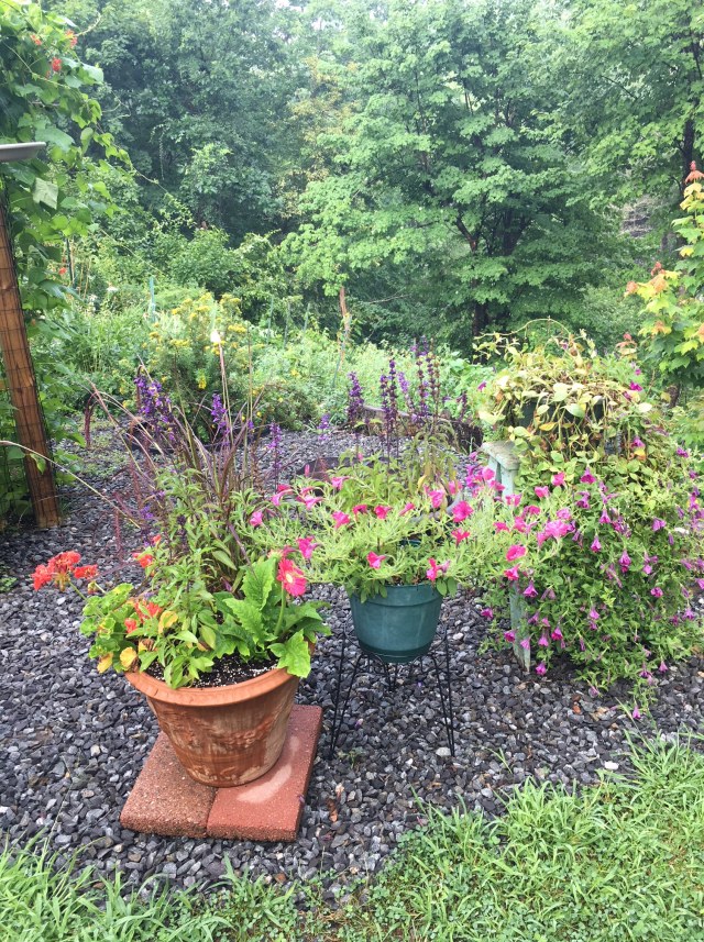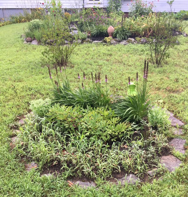 Let’s call this my “oops” garden, or the one I haven’t spent much time on this summer. I am planning to remove the peony, because peonies need more sun and they need to be with other peonies. I don’t know what I will put here; maybe tulips and then some annuals. I like the liatris, though, and you can see the green garden frog to the right, faithful and true.