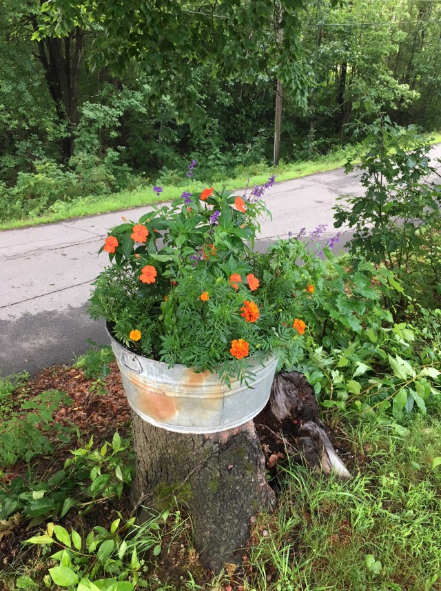 This spring, I had some tree work done. The arborist removed the remaining twin tree from a blizzard casualty a few years ago. Then he leveled off the stump and I put this galvanized planter there.