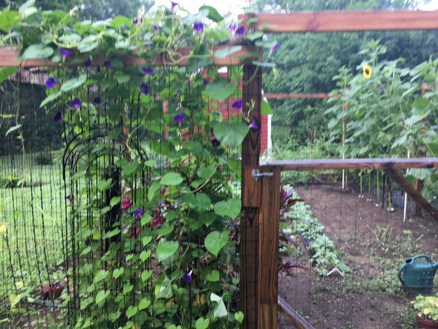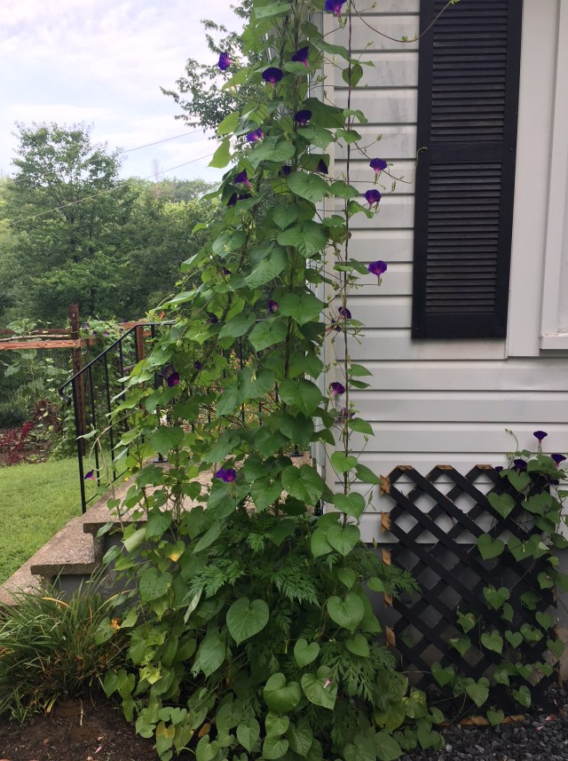 Moving along, we are now at the back door and the Grandpa Ott morning glory trellis. I have planted other colors, but these purple ones are all volunteers from last year. Grandpa Ott is an old heritage seed; it’s very hardy, probably like Grandpa himself.