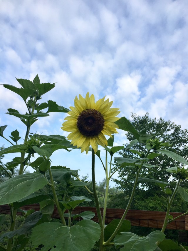 Crossing back across the lawn, we find ourselves at the “vegetable garden.” Apologies for the blurry Grandpa Ott’s. This year, I’m growing cucumbers, tomatoes, and kale. A baby woodchuck snuck in through the wires and ate my squash plant, so I’ll be putting some chicken wire along the bottom of the fencing. The little one is probably too big to squeeze in now, but I noticed a few hungry squirrels inside the fence this summer and they did quite a bit of damage to my sunflowers, as you will see.