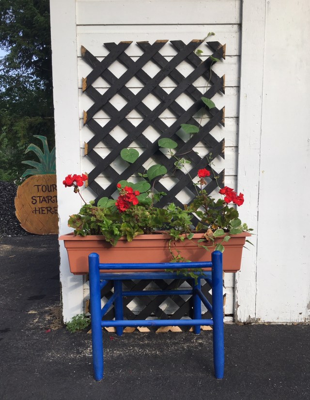 This spot is behind the sign and the rock pile; next to the garage. Speaking of the garage, let’s take a few steps back and see the “little garden” in front of it. Faye the Barber once painted her barbershop steps the same blue as I painted that old chair frame. The geraniums look a little tired, don’t they?