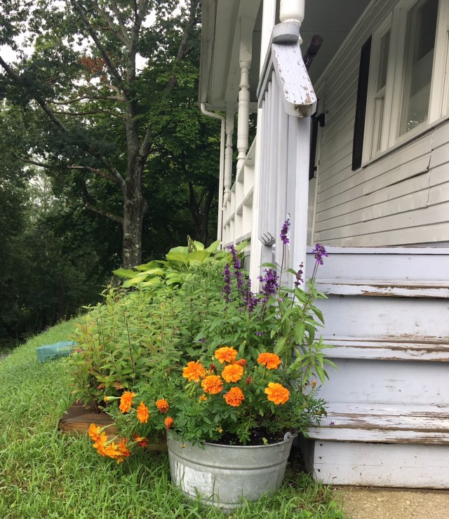 Taking a few more steps back, we are now at the front porch. I would like to restore the porch to its original state. The current structure is circa 1970’s. Behind the galvanized container is a spot that glows with sun drops earlier in the summer.