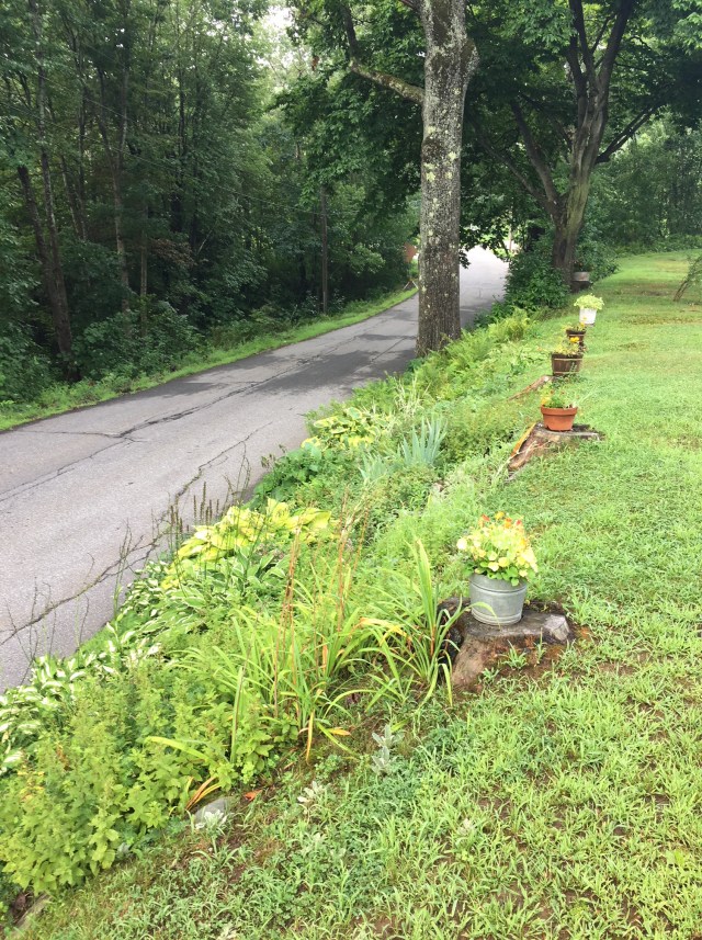 Here is another angle along the back of the vegetable garden. It’s lovely in the spring, that iris clump. But at this point in the summer, even the daisies have gone by.