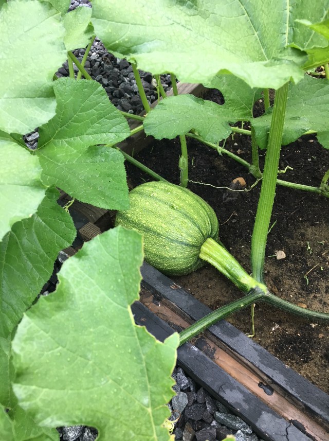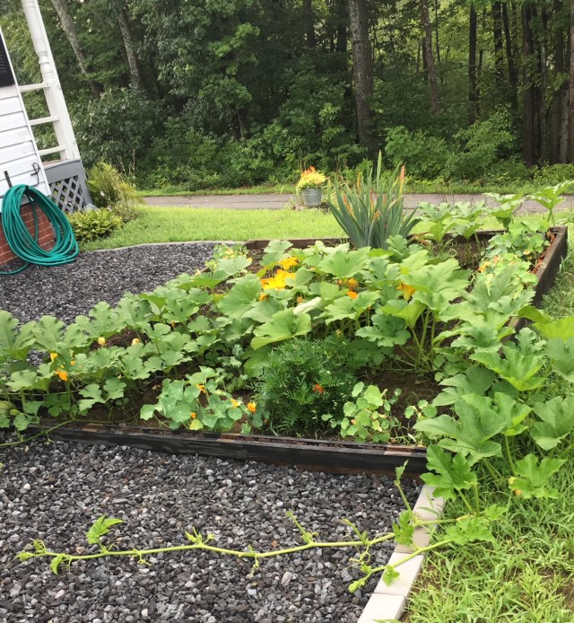 As we turn right, we are at a raised bed installed in 2014. I have a few tulips here in the spring and the Kennebec Valley Garden Club iris. This year, I threw some old pie pumpkin seeds in this spot and I’m happy with the results. Someone, who I will discuss later, has been nibbling at the leaves, but not enough to do significant damage.